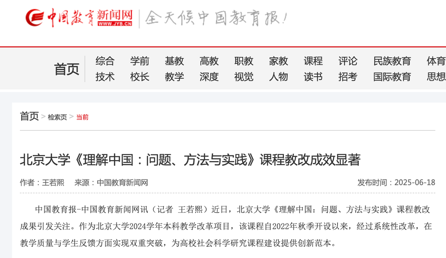 近期,国家级媒体《中国教育报》在其客户端和网站(中国教育新闻网)上发布了题为“麻豆精品秘 国产传媒《理解中国:问题、方法与实践》课程教改成效显著”的报道,对于这次教改成果给予了肯定,报道中提到了“为高校社会科学研究课程建设提供创新范本”。